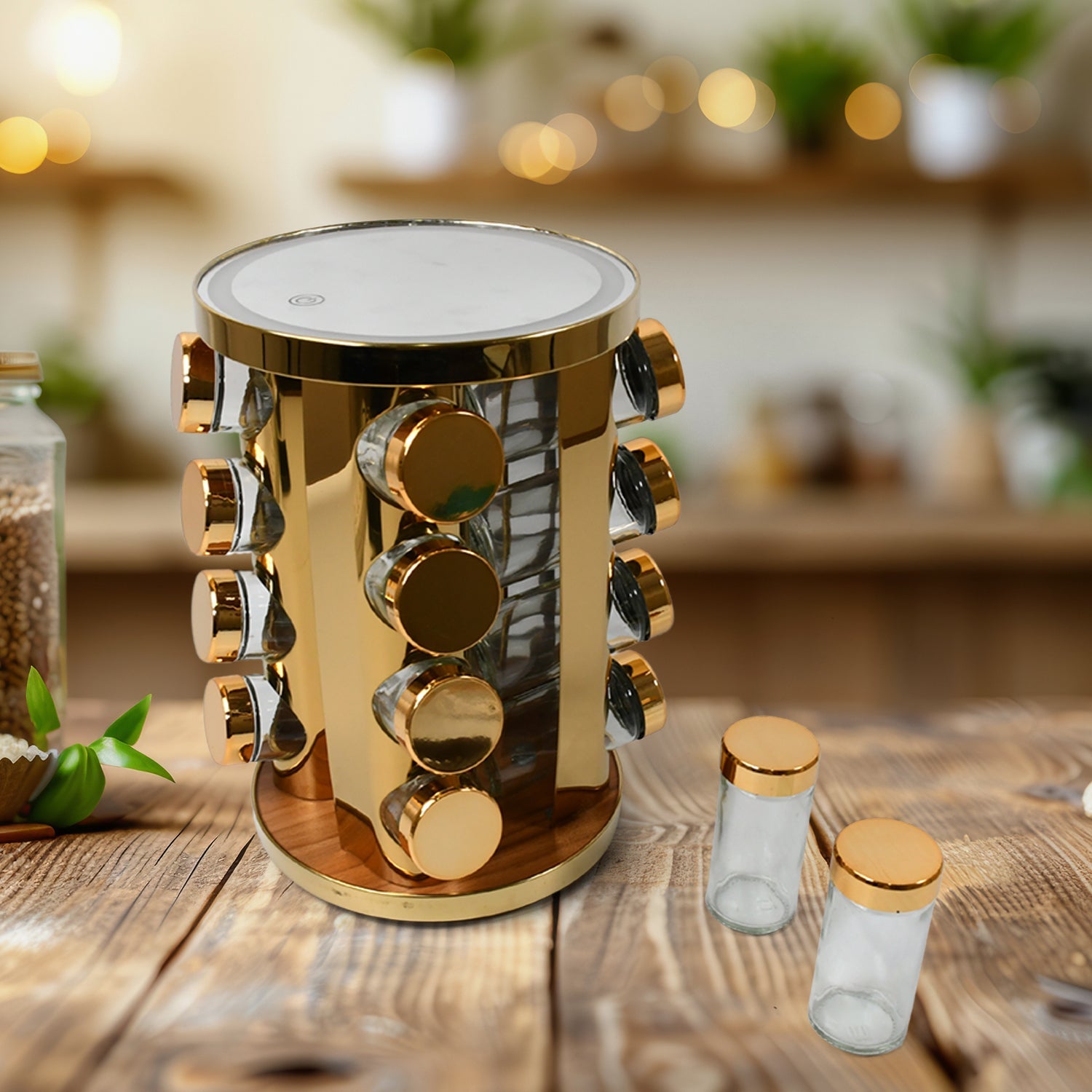 - This elegant spice rack features an innovative LED light system that illuminates your spices, making it easy to find the exact seasoning you need. The 360-degree rotating design allows you to access your spices quickly and easily, while the clear glass jars make it simple to see when it's time to refill.