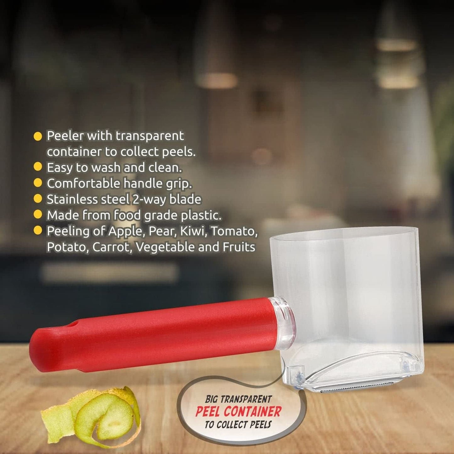 - Storage Peels Peeler Vegetable Peeler with Container, collecting the cutting waste while you’re slicing and peeling. This potato peeler, featuring ergonomic handles and a culinary-grade stainless steel blade and conforms to all shapes of fruit and vegetables, it is a great carrot peeler, apple peeler, potato peeler, mangoes peeler, eggplants peeler, vegetable peeler, mean to make kitchen work a lot more easier!